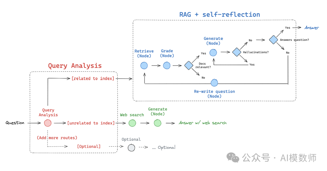 自适应RAG是结合问题分析和Self-RAG的一种方法。先分析问题是否适合RAG,还是应该去互联网查找资料,或者直接通过大模型回答。
