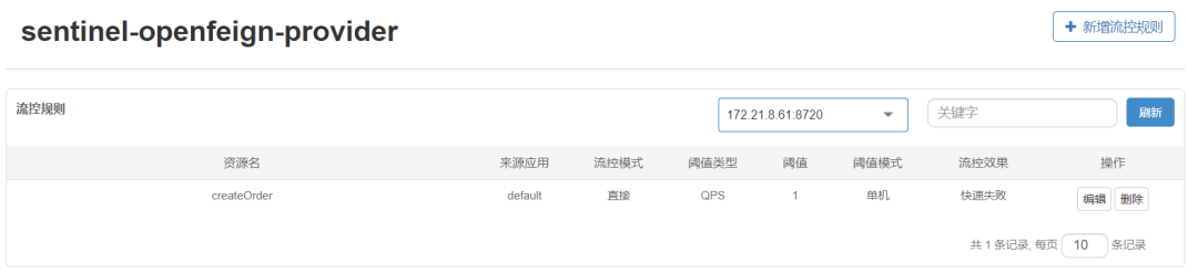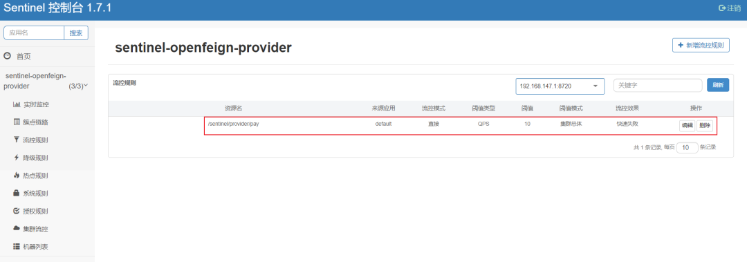 Nacos推送成功后将会在sentinel控制台看到这条流控规则的配置,如下图: