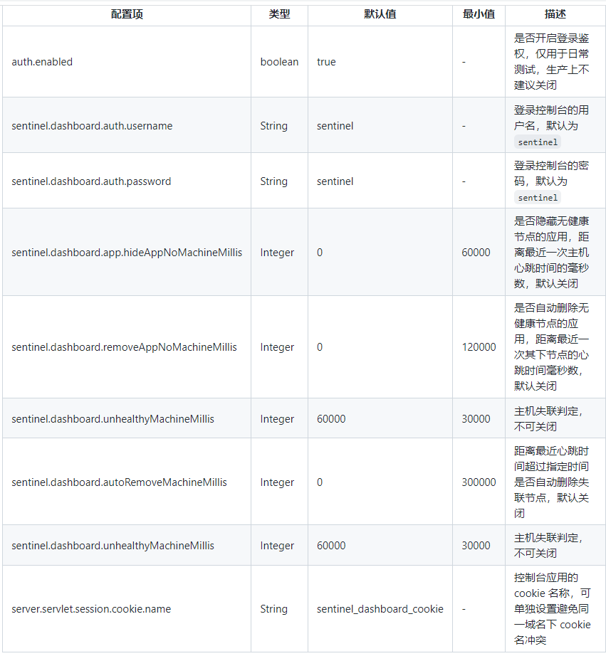 除了用户名密码相关的配置,sentinel控制台还提供了其他的可配置选项,如下图: