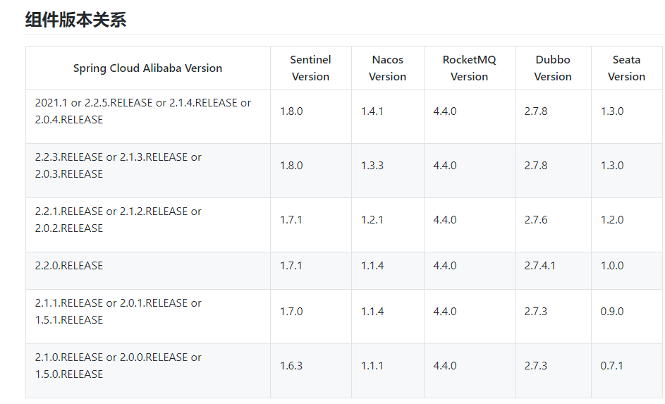 这里选择的spring-cloud-alibaba-dependencies的版本是2.2.1.RELEASE,因此sentinel版本选择1.7.1,大家可以根据自己的版本选择对应sentinel的版本,版本对应关系如下图: