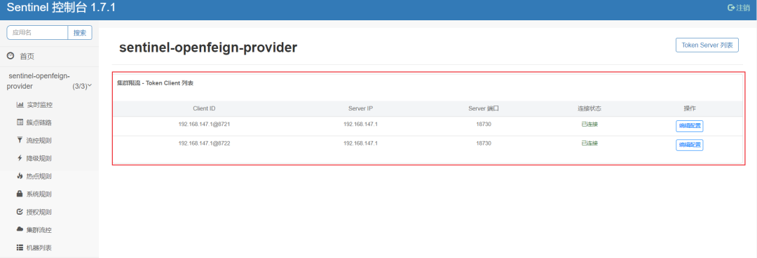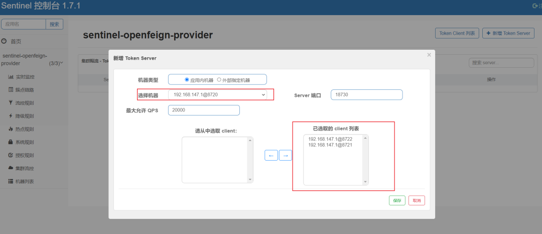 此时只需要在控制台指定一个服务为token server,其他的为token client,集群流控->新增token server,操作如下图: