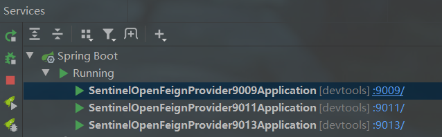 就以sentinel-openfeign-provider9009这个模块作为演示,直接启动三个集群,端口分别为9009、9011、9013,如下图: