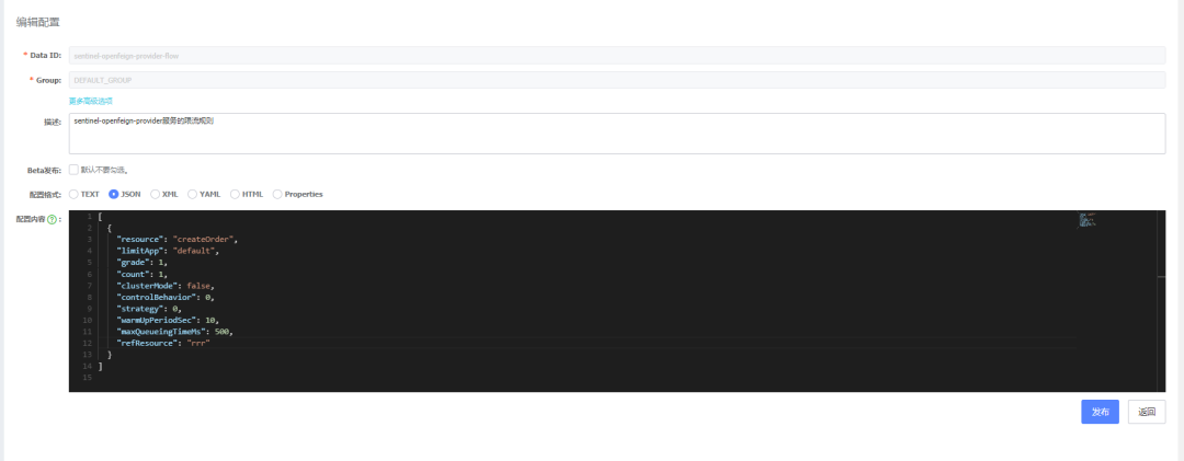 此时就可以添加集群流控规则了,可以在sentinel控制台直接添加,也可以通过Nacos直接配置,下图是通过Nacos配置的,如下图: