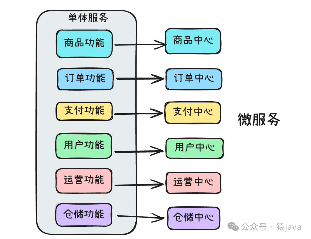 由于上述局限性,许多企业选择将单体应用系统逐步转型为微服务架构,微服务架构可以通过将大型应用程序分解为多个小型、独立的服务来避免单体架构的限制,从而实现更高的灵活性、可扩展性和故障隔离。