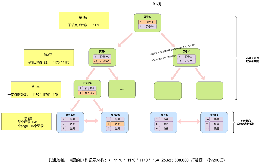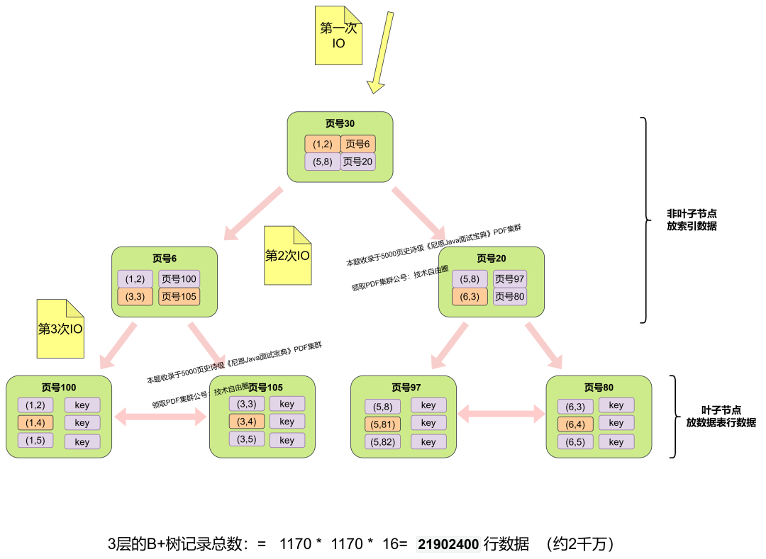 第一层、第二层 都是 非叶节点(索引页), 用来存储 key + 页指针
