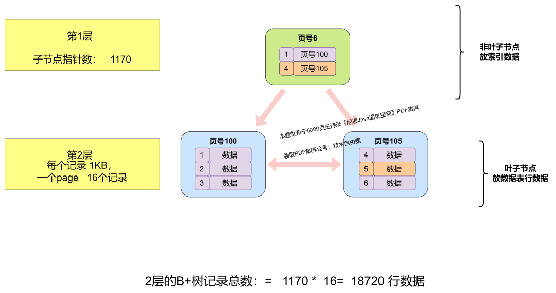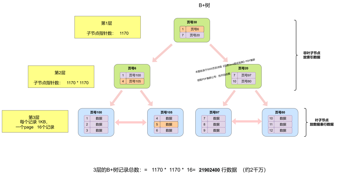 也就是说一个非叶子节点中能够存放 1170 个指针,即对应 1170 个叶子节点,