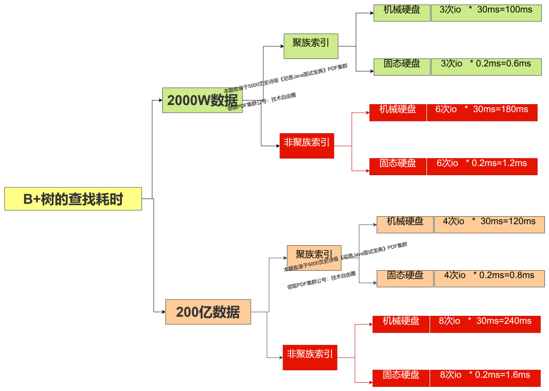 尼恩给大画了一张图,进行了一下 聚族索引、非聚族索引 、固态硬盘、机械硬盘下的 B+树的查找耗时对比, 具体如下: