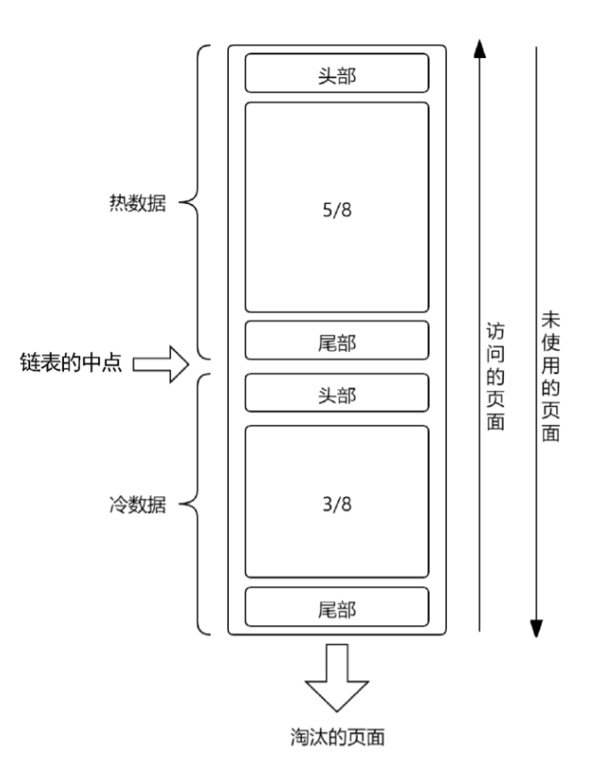 - 当数据页首次被读入缓冲池时,它将被插入链表的中点(冷数据的头部)。