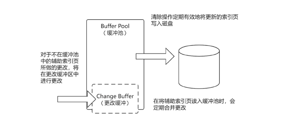 更改缓冲区是一种特殊的数据结构,当二级索引页不在缓冲池时,它会缓存二级索引更改。更改的类型包括insert、update、delete等DML操作。更改缓冲区会缓存多次二级索引更改操作,并在合适的时间写入磁盘,如图所示。