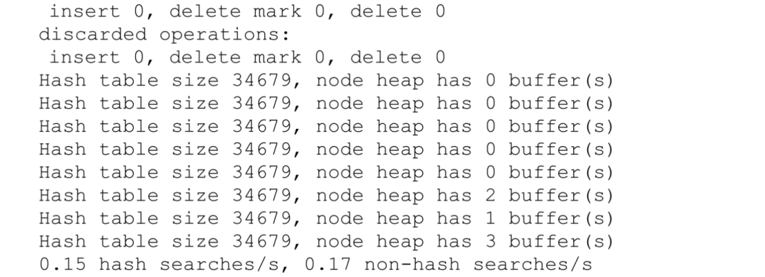 自适应哈希索引以哈希表的方式实现,由数据库自身实现并管理,使用者不能对其进行干预。需要注意的是,对于等值查找,自适应哈希索引可以提高查找效率。但范围查找或模糊查找是不能使用自适应哈希索引的。可以通过show engine innodb status语句查看自适应哈希索引的使用情况: