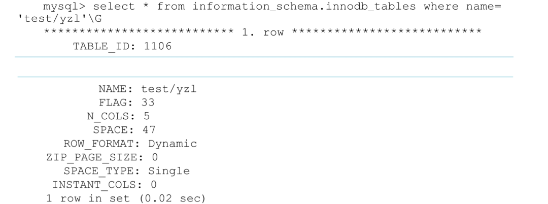 除此之外,还可以通过information_schema.innodb_tables表查看: