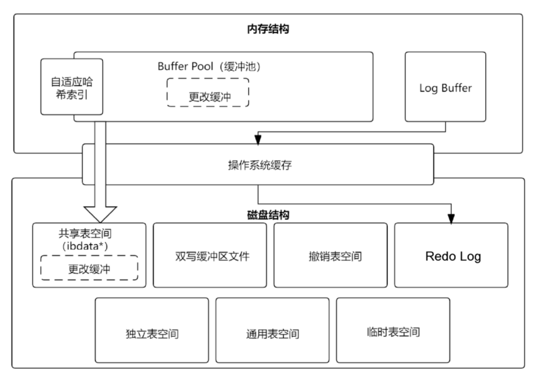 nnoDB的磁盘结构主要包含各种表空间文件、Redo Log文件、双写缓冲区文件等。