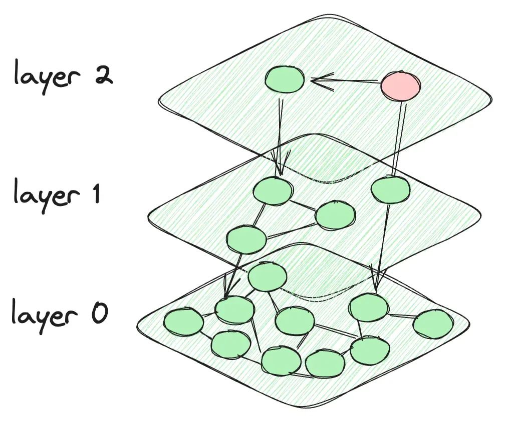 HNSW 创建了类似概率跳表的层。但是对于数据点之间的连接,它在节点之间建立了一个图形化的连接。每一层的节点不仅连接到当前层的节点,而且连接到下层的节点。当我们向下到较低的层时,顶部的节点非常少,强度增加。最后一层包含数据库的所有数据点。下图是 HNSW 的结构示意。