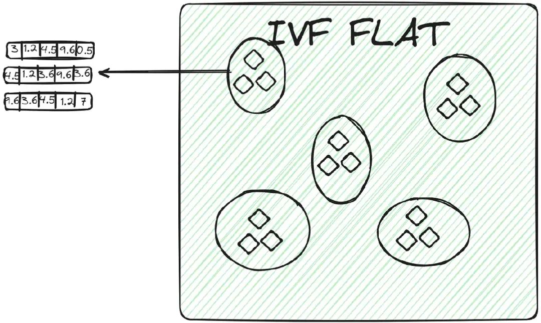 在每个集群中,向量存储在一个简单的列表或数组中,没有额外的细分或层次结构。当一个查询向量被分配给一个集群时,最近的邻居通过执行一个暴力搜索法,检查集群列表中的每个向量并计算它到查询向量的距离来找到。IVFFLAT 用于数据集不太大的场景,其目标是在搜索过程中实现高精度。
