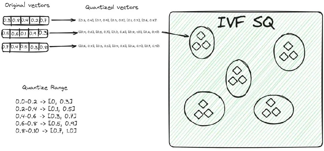 IVFSQ,像其他IVF变体一样,也将数据分割成集群。然而,其主要区别在于其量化技术。在IVFSQ中,集群中的每个向量都通过标量量化传递。这意味着向量的每个维度都是单独处理的。