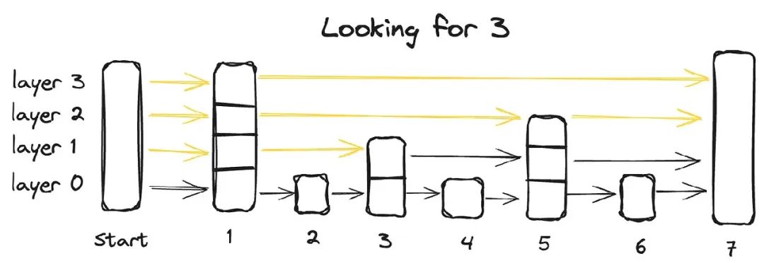 概率跳表是一种高级的数据结构,它结合了两种传统结构的优点: 链表的快速插入能力和数组的快速检索特性。它通过其多层架构来实现这一点,其中数据跨多层组织,每一层包含数据点的子集。从包含所有数据点的底层开始,每个后续层都会跳过一些点,因此数据点较少,最终最顶层的数据点最少。要在跳过列表中搜索数据点,我们从最高层开始,从左到右搜索每个数据点。在任何时候,如果查询的值大于当前数据点,我们将返回到下一层中的前一个数据点,从左到右继续搜索,直到找到确切的点。