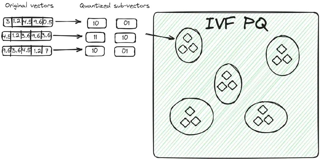 IVFPQ(Inverted File Vector Product Quantization)是IVF的一个高级变体,代表通过乘积量化实现的倒排文件索引。它同样将数据分割成簇,但在每个簇中,向量被进一步分解为更小的向量片段,每个部分通过乘积量化编码或压缩成有限的比特数。