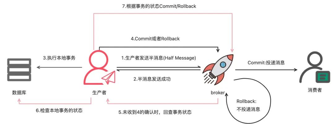 消息提交或回滚:在回查后,生产者根据本地事务的执行结果提交或回滚事务消息。如果提交,消息变为可投递状态;如果回滚,消息将被删除。