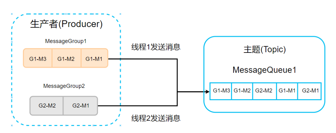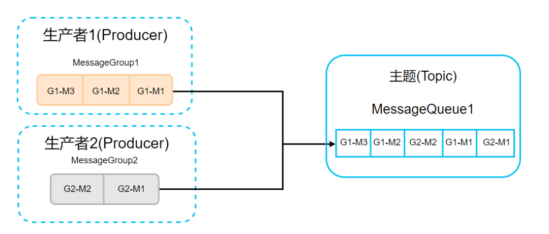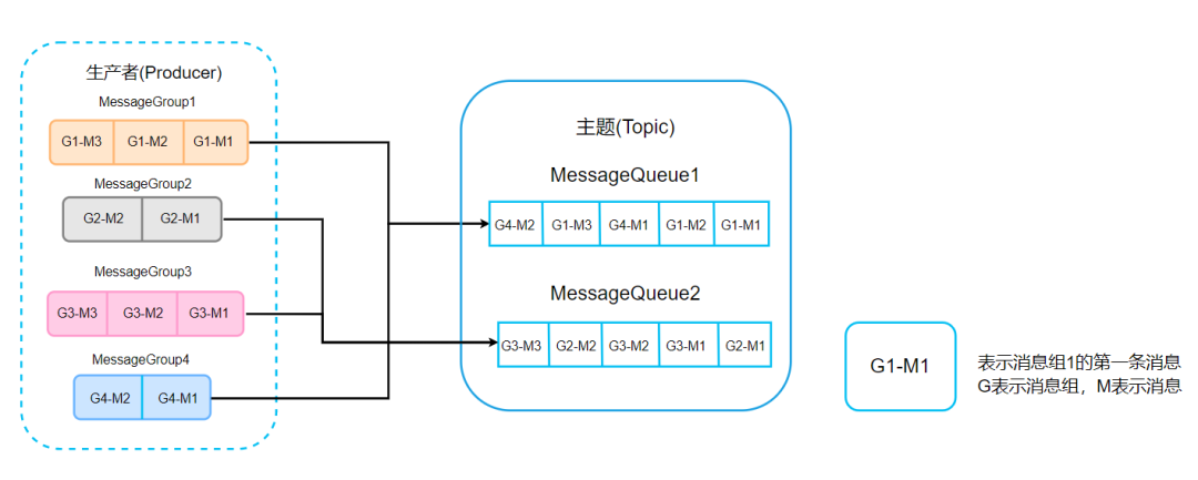 如上图所示,消息组1和消息组4的消息混合存储在队列1中,消息队列RocketMQ保证消息组1中的消息G1-M1、G1-M2、G1-M3是按发送顺序存储,且消息组4的消息G4-M1、G4-M2也是按顺序存储,但消息组1和消息组4中的消息不涉及顺序关系。