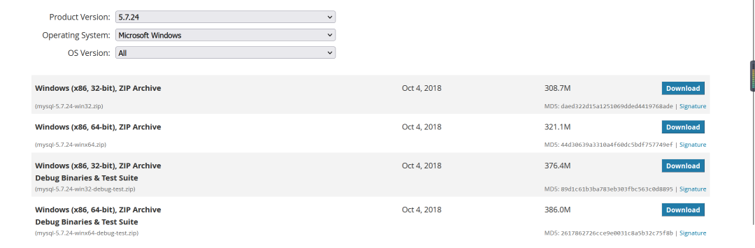这里选择下载的产品版本是 5.7.24 ,原因是各个库支持的最完善且相对于最新版本更加的稳定。