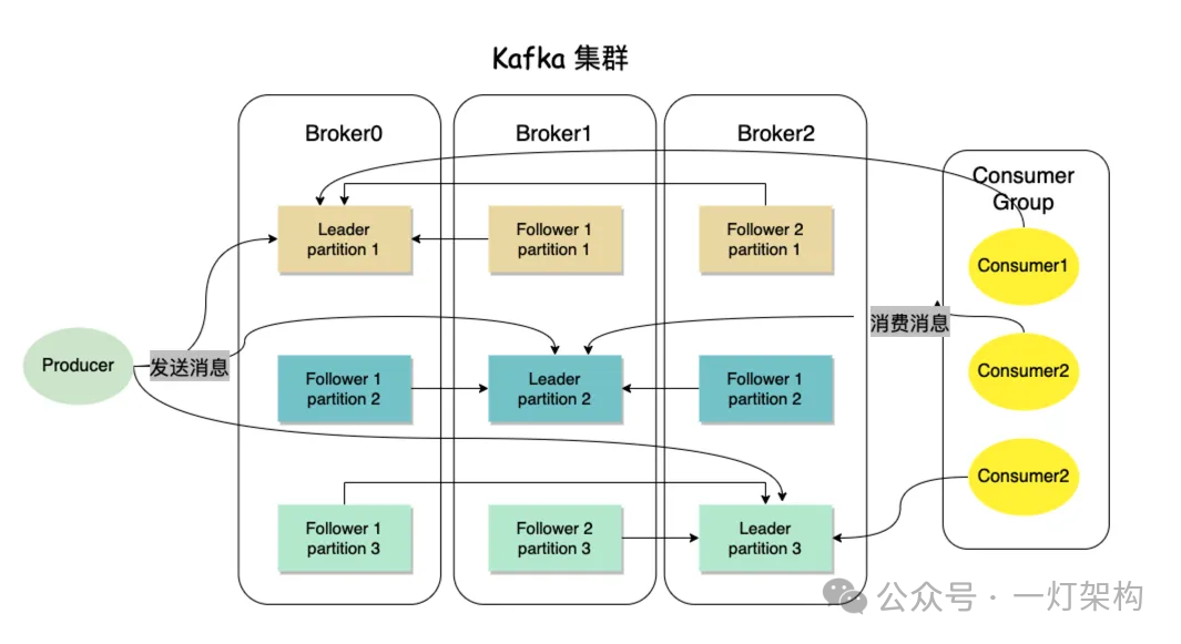 领导者和追随者: 每个分区有一个领导者(leader)和多个追随者(followers)。所有的读写请求都由领导者处理,而追随者则从领导者那里复制数据。如果领导者发生故障,系统会从追随者中选举出新的领导者。