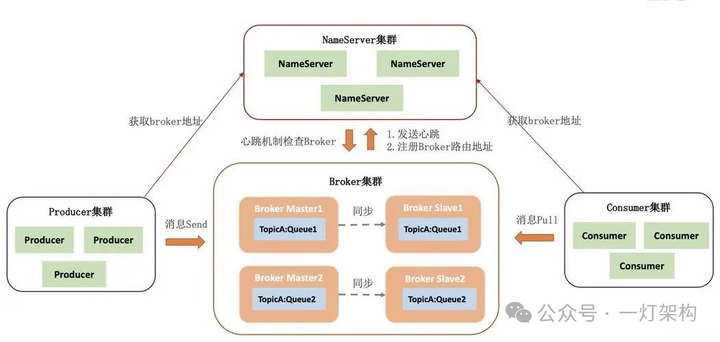 RocketMQ 明确区分了 Broker 和 NameServer 的角色。Broker 负责消息存储和传输,而 NameServer 提供路由信息和服务发现功能,不参与消息传递。