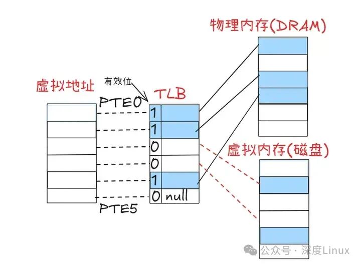 每条 PTE 都由一个有效位和一个 n 位地址组成。如果 PTE 的有效位为 1,则 n 位地址表示相应物理页的起始位置,即虚拟地址能够在物理内存中找到相应的物理页。如果 PTE 的有效位为 0,且后面跟着的地址为空,那么表示该虚拟地址指向的虚拟页还没有被分配。如果 PTE 的有效位为 0,且后面跟着指向虚拟页的地址,表示该虚拟地址在物理内存中没有相对应的物理地址,指向该虚拟页在磁盘上的起始位置,我们通常把这种情况称为缺页。