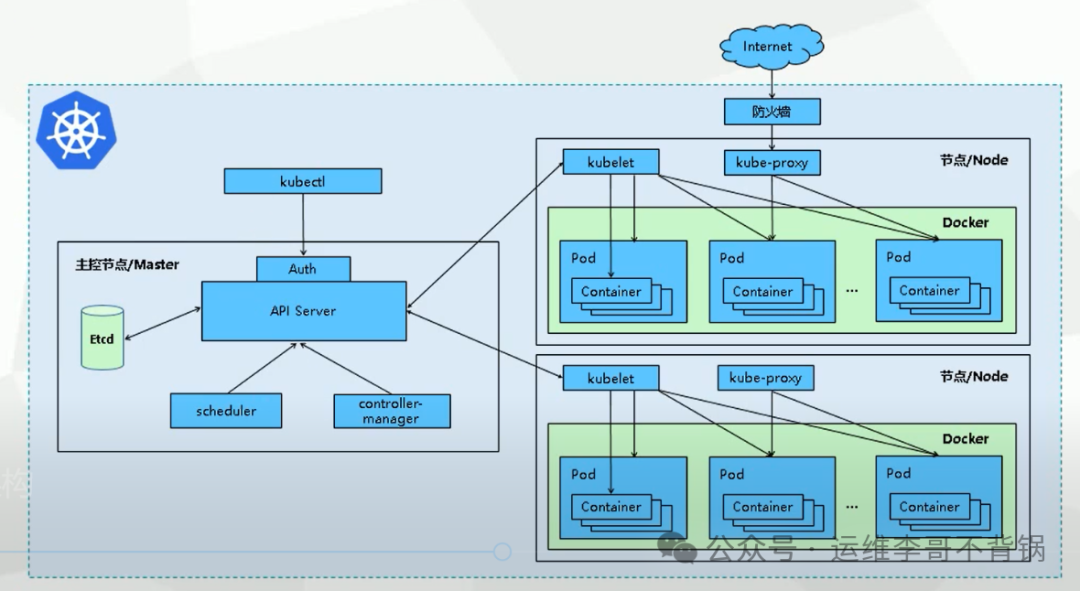 下面是K8S整个架构图,可以看到整体的关联关系和网络走向