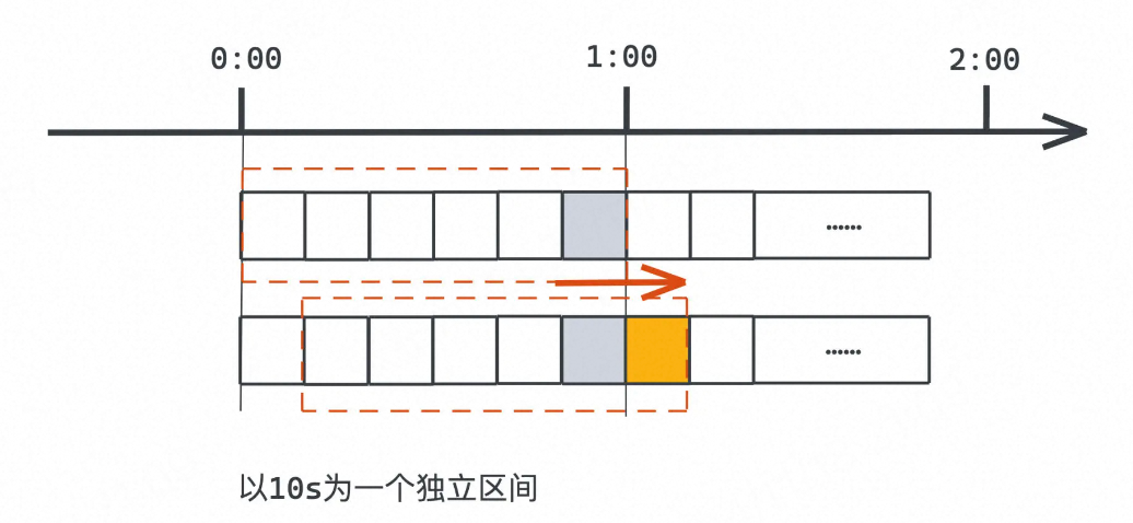 - 将大的时间区间(如上面例子中的1分钟)划分为多个固定大小的小区间(例如10秒)。