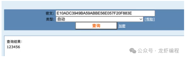 MD5加密方式会出现不同密码加密之后产生相同的hash(也就是hash冲突),另外MD5加密后一个得到的密文永远是唯一的,如下使用MD5加密得到123456的密文: