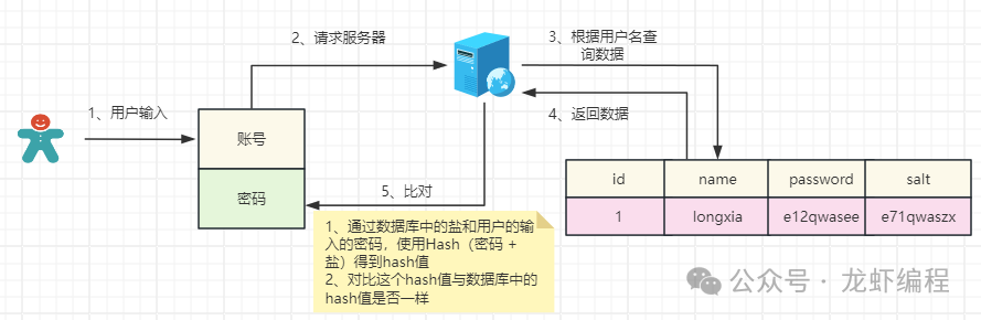 用户登录的时候,首先根据name查询用户在数据库中的数据,然后服务端根据盐+用户输入的密码进行hash计算得到hash值A,拿A与数据库中的密码hash值B做对比,如果A和B相同则可以让用户登录,否则提示账号或者密码不对。