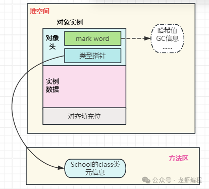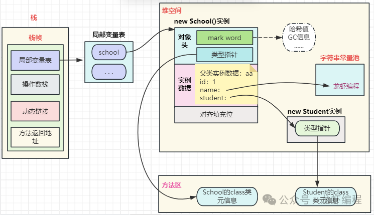 栈帧上的局部变量表中的school指向堆空间的上的实例,对象头中的类型指针(class pointor)指向方法区的School类元信息,School中的属性数据存在到实例数据这块区域上(如果属性是对象,那么会使用指针指向其对象上)。