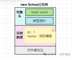 每当我们创建School对象的时候,在Java的堆中开辟内存存放对象,在栈上存放栈帧的信息,如下所示是Java对象在jvm中的布局信息: