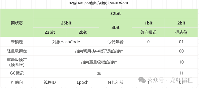 (1)Mark Word:用于存储对象自身的运行时数据,如哈希码、GC分代年龄、锁状态标志等等一些信息。为了实现在极小的空间内存储尽量多的数据,Mark Word被设计成动态定义的数据结构,它可以根据对象的状态复用自己的存储空间(也就是说在运行期间Mark Word存储的数据会随着标志位的变化而变化)。如下是32位的HotSpot虚拟机中Mark Word的详细信息: