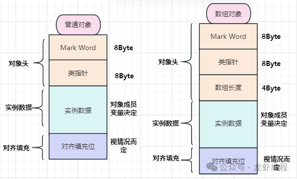 在Java中普通对象和数组对象的对象在布局上存在一定的差异,数组对象相比普通对象多了数组长度部分,如下图所示: