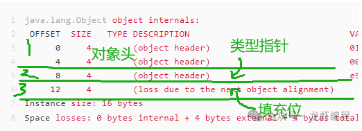 这个结果中输出了Object对象的对象头、类型指针和对齐填充的信息,如下是对各个部分的解释图: