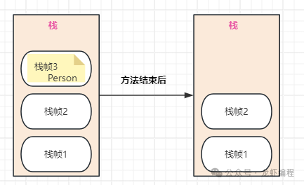 Person对象在栈上分配了,此时栈帧3对应的方法调用结束后,就会弹出栈,那么Person对象占用的空间也就随之释放。
