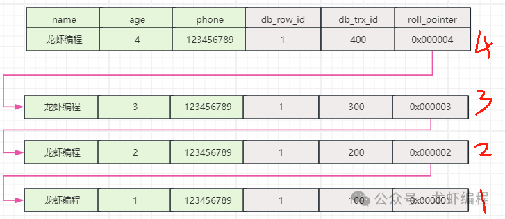 这样每一个更新的快照中都有一个db_trx_id字段记录了本次变更的事务id,并且有一个roll_pointer指向了上一个快照的地址。