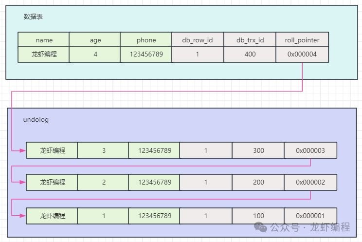 每一次update行记录的时候,都会在变更之前先存储一份快照到undo log中,此时这三个隐式字段也会跟着记录一起保存在undo log中,如下如所示:
