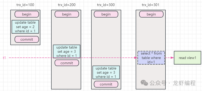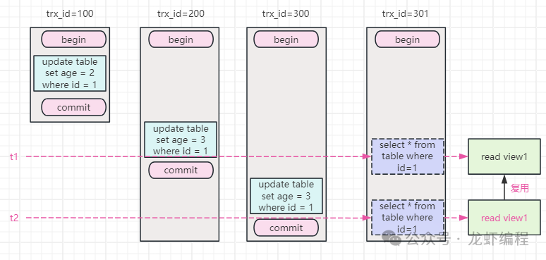 在t2时刻read view2中的信息:活跃的事务的trx_id是300、301,活跃事务中最小的事务id是300,最大的事务id是302(也就是301+1),创建读视图的事务的trx_id是301。此时最小的已经提交的事务id是200,那么和t1时刻一样从undolog版本链中找到200事务对应的数据,也就是 roll _pointer= 0x 00002的数据。