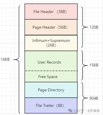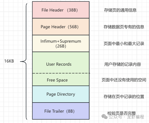 在前面我们提到过Mysql的Page页的结构,这里就不再赘述,一个16KB的数据页,B+树叶子节点里放了行数据,如下所示的叶子节点上的数据页结构: