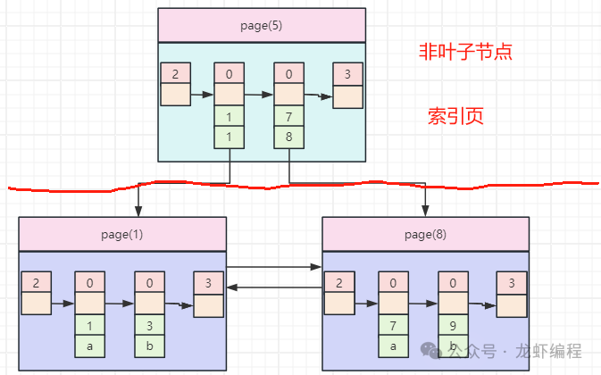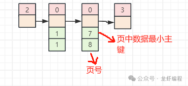 在索引页中存储的数据是叶子节点中数据的主键和数据页号,如下所示的索引页存储的数据: