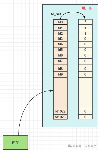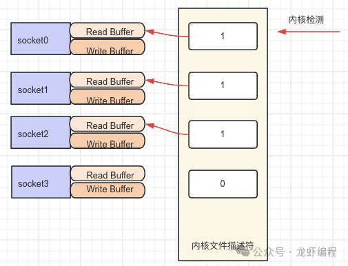 (3)内核根据传入的文件描述符对应位置上的值做判断,如果bit位上的值是1就检测对应的Socket上的读缓冲区数据,如果 bit 位上是0就不做检测,如下图所示: