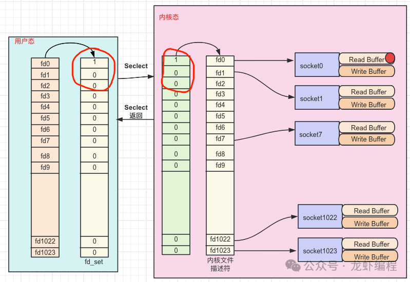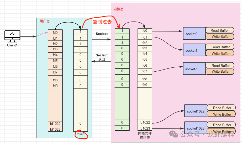 内核修改好内核上的文件描述符之后,重新的将内核文件描述符信息写会用户态的fd_set上,如下图所示: