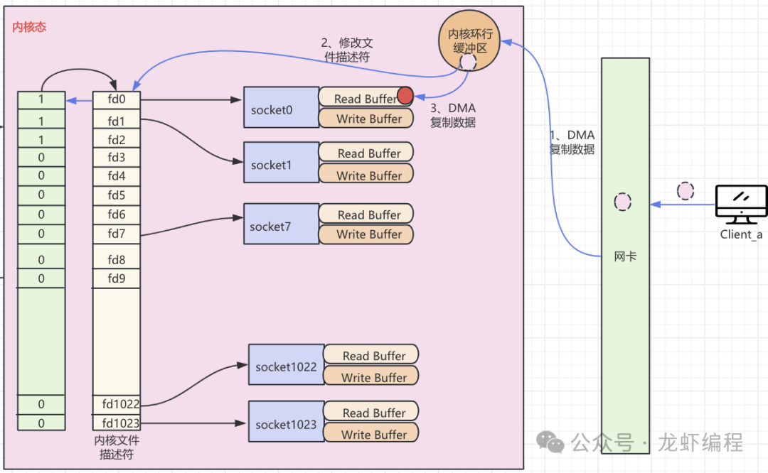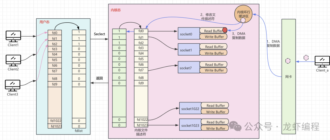(2)设置好读取缓冲区的参数之后,由select函数将数据复制到内核的文件描述符上