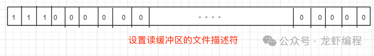 此时Socket0中会通过DMA技术复制数据到读缓冲区上,那么对应的文件描述符为就绪状态。内核根据文件描述符表依次线性执行下去,假设seclet函数设置了超时时间,如果在规定时间内还没有数据到达监听Socket上,此时内核将文件描述的bit位上的1修改成0(修改成0表示不满足就绪条件 ),如下所示: