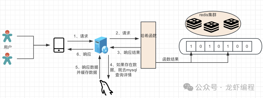 如果用户的请求过来了,先查询Redis缓存,如果Redis无数据再去查询MySQL,当 MySQ L 中也不存在这条数据时,那么每次查询都要访问数据库,这就是缓存穿透。为了解决缓存穿透问题,我们在Redis前面添加一层布隆过滤器,请求先在布隆过滤器中判断,如果布隆过滤器不存在时,直接返回而不做后续的数据库查询操作。我们使用bitmap完成布隆过滤器的功能,其实现的流程图如下: