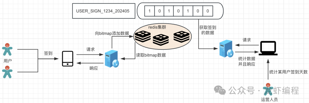 bitmap在数据统计方面也是非常优秀的,典型的场景有日活跃用户量的统计、最近—周的活跃用户、统计指定用户一个月或者一年之中的登陆天数等等。下面统计用户签到的数量为例。