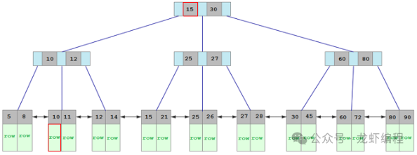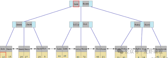 二级索引的是非叶子结点上存储的是索引值和页码信息,案例图如下: