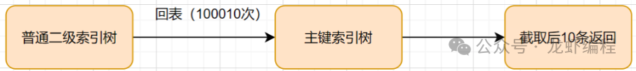 回表查询:获取二级索引叶子结点上的id再去主键索引中获取id对应的行数据信息的过程。回表查询过程如下图: